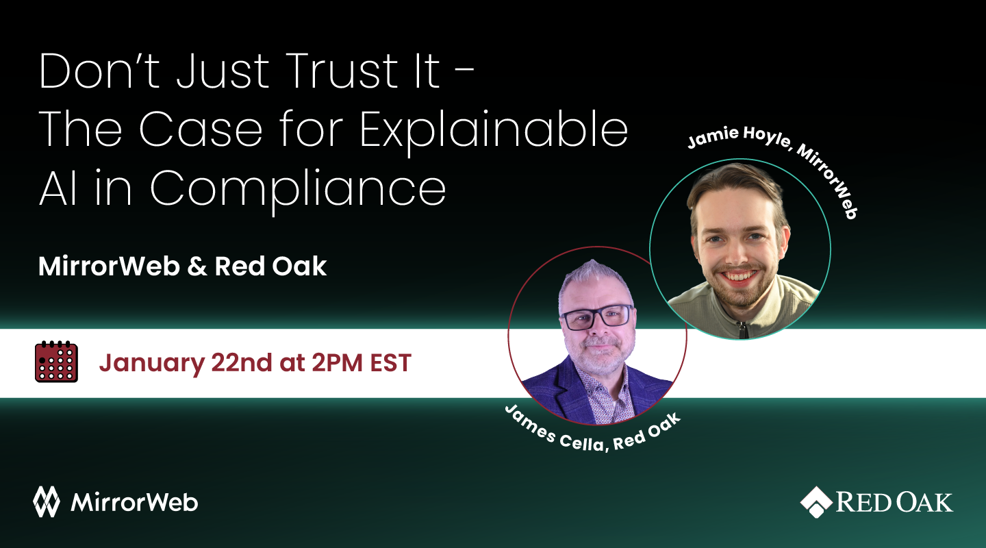 Jamie has been helping compliance teams navigate regulatory challenges for the past decade, leading product strategy at MirrorWeb with a passion for innovation that goes beyond checkbox compliance. He believes in building efficient, user-friendly solutions that capture data in its most natural format rather than forcing everything into outdated paradigms. Jamie is passionate about leading innovation in compliance technology - creating purpose-built solutions designed from the ground up rather than retrofitting capabilities onto existing products.