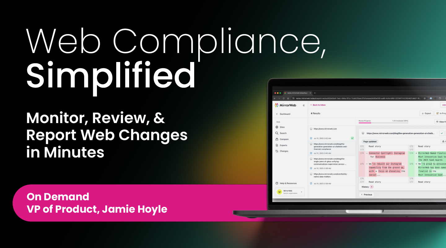 Join Jamie Hoyle, VP of Product at MirrorWeb, for a live demonstration of the number one requested feature from compliance teams: intelligent website monitoring built directly on high-fidelity archives.